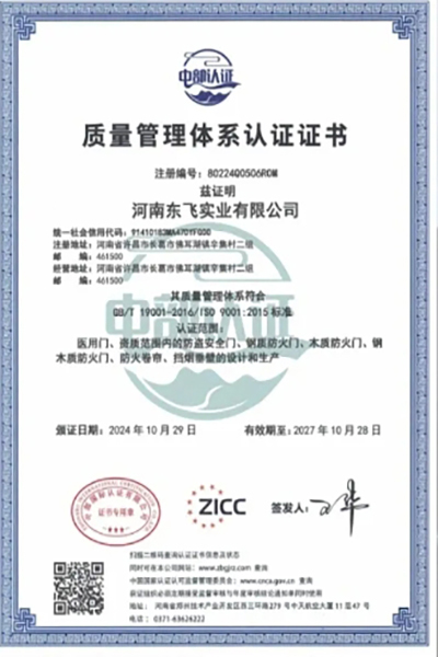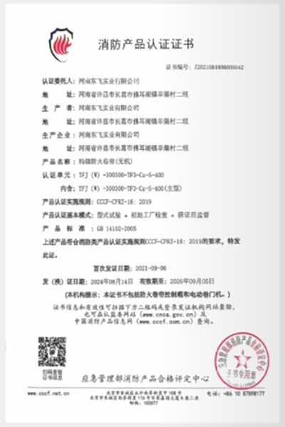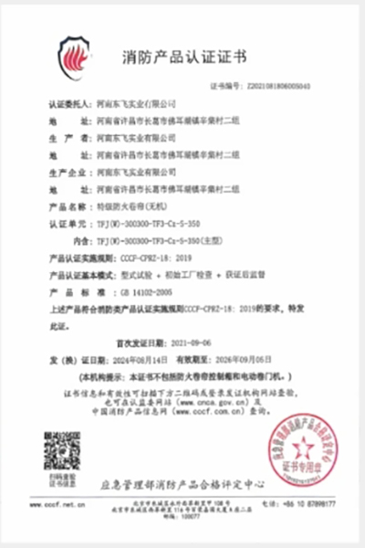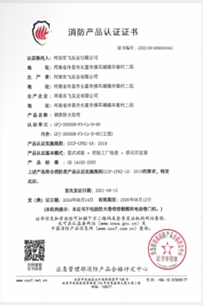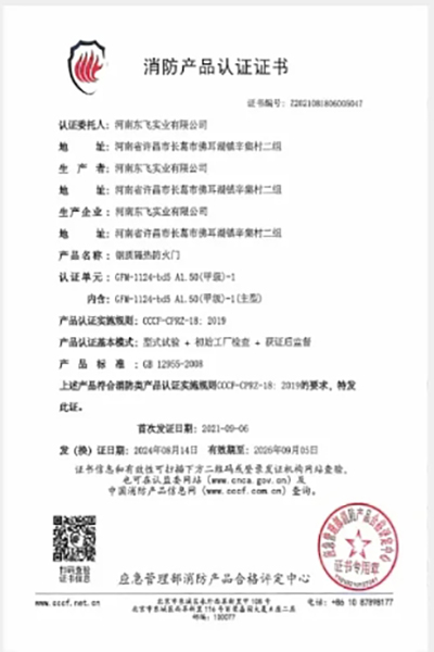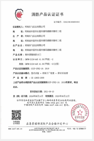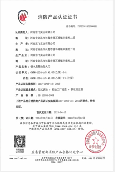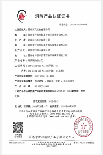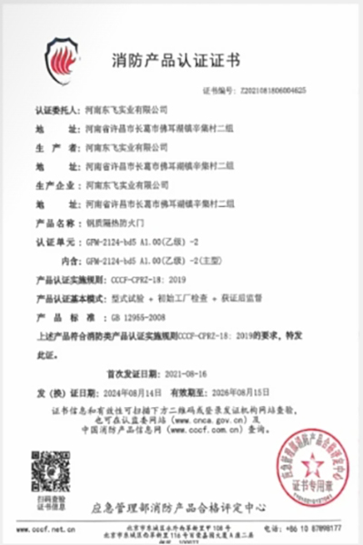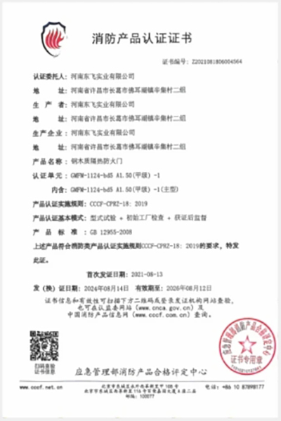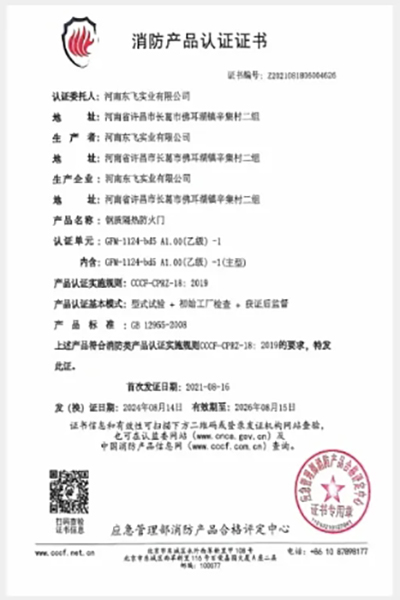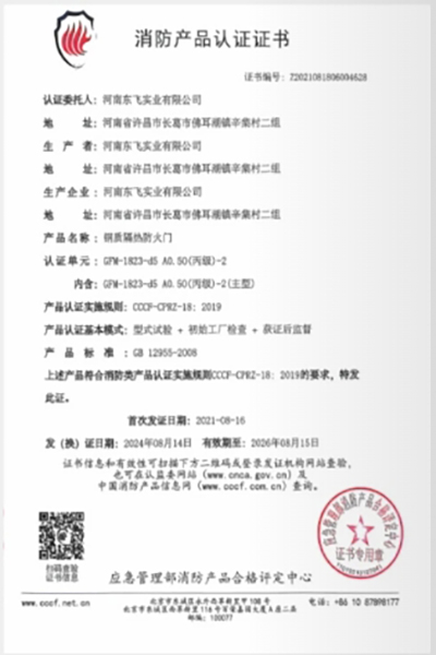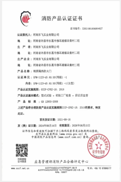 河南東飛實(shí)業(yè)有限公司(東飛利防火門窗)是一家集研發(fā)、生產(chǎn)、銷售、安裝于一體的防火門窗、消防產(chǎn)品專業(yè)化企業(yè),主要產(chǎn)品有各種鋼質(zhì)防火門、鋼木質(zhì)防火門、木質(zhì)防火門、學(xué)校門、防盜門、防火卷簾、防火窗等。公司所經(jīng)營的消防產(chǎn)品均通過了應(yīng)急管理部消防產(chǎn)品合格評(píng)定中心的檢驗(yàn),獲得了消防產(chǎn)品認(rèn)證證書。憑借嚴(yán)格的生產(chǎn)管理體系、質(zhì)量體系、售后服務(wù)體系走在市場(chǎng)前列。以“誠信為根、質(zhì)量為本、服務(wù)至上”的服務(wù)宗旨,培養(yǎng)了一批有責(zé)任有擔(dān)當(dāng)?shù)纳a(chǎn)、管理、營銷人才,堅(jiān)持以務(wù)實(shí)態(tài)度、創(chuàng)新精神、厚德品質(zhì)為客戶提供好服務(wù)。公司產(chǎn)品在選材、工藝、技術(shù)、質(zhì)量等方面具有優(yōu)勢(shì)。首先我們?cè)诋a(chǎn)品設(shè)計(jì)上敢為人先,注重企業(yè)自主能力建設(shè)和品牌建設(shè),生產(chǎn)的防火門、防火窗、防火卷簾等系列產(chǎn)品以高質(zhì)量的的材料、創(chuàng)新的工藝和技術(shù)、完善的售后服務(wù)受到了廣大客戶的贊譽(yù)。